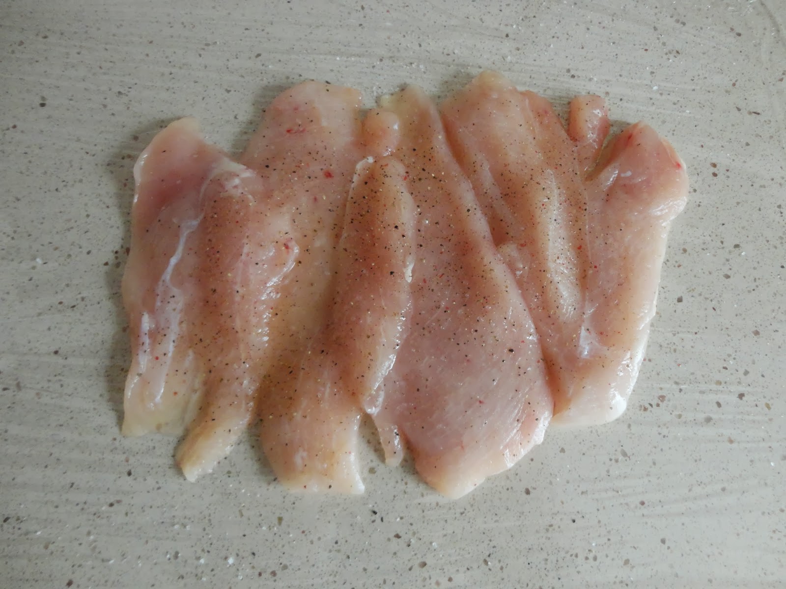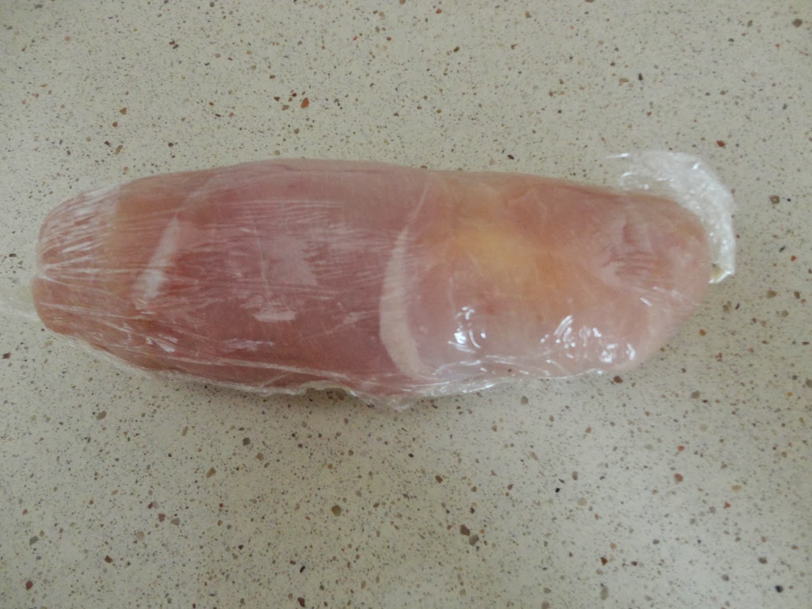 Basta estender a película aderente em uma superfície limpa e coloque nele os peitos de frango salpimentadas. Coloque-os bem estirados, sobrepostos uns sobre os outros, para depois formar um cilindro.